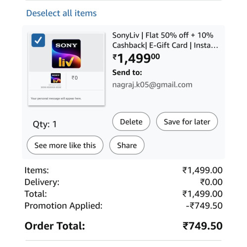 SonyLiv | Flat 50% off + 10% Cashback| E-Gift Card | Instant Delivery | Valid for Website purchases