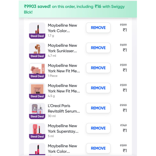 – Go to cart section and add select Maybelline and L’Oréal products for just ₹1