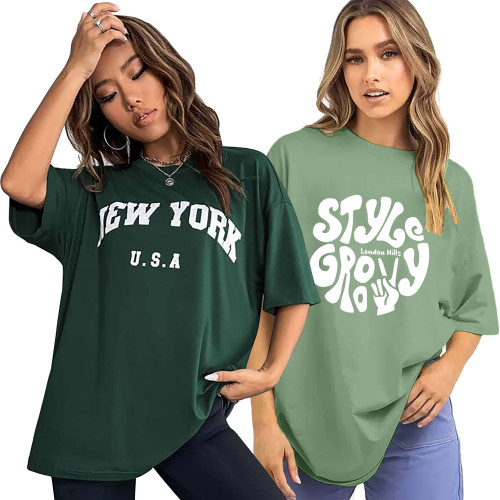 Pack of 2 Printed Cotton Blend Round Neck T-Shirts for Women